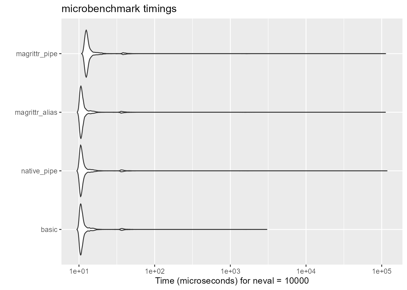 この中だとmagrittrパイプだけが非常に遅いです。ちなみにキャッシュを使っていないので、レンダリングするたびにベンチマークの結果が変わるのですが(ネイティブパイプとmagrittrエイリアスに差があることになったりならなかったり)、magrittrパイプが遅いのだけは変わらないです。ただし、この結果の単位はナノ秒です。体感できる差ではありません。
